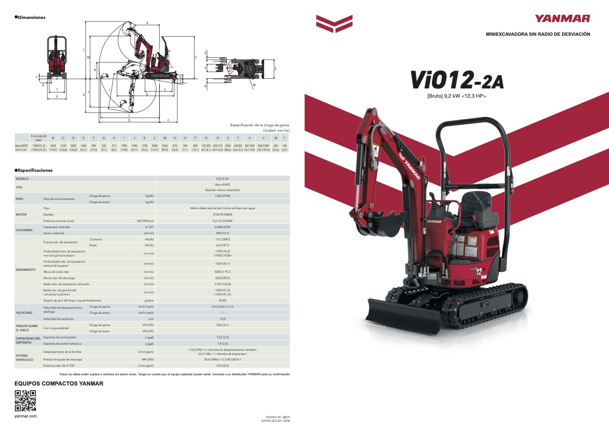 Especificaciones técnicas oficiales de la miniexcavadora ViO12-2A de YANMAR.